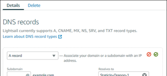d.将域的 DNS 记录的管理权限转移到 Lightsail 之后,添加一个 A 记录以将域的顶级域名指向 WordPress 实例,如下所示: