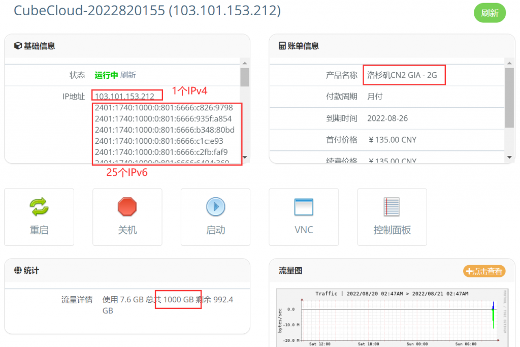 CubeCloud魔方云洛杉矶Pro系列VPS控制台信息,默认给到1个IPv4和25个IPv6: