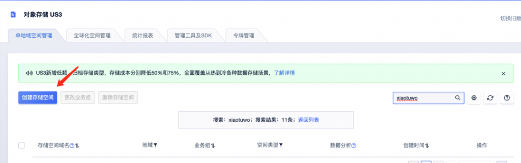 进入空间以后填写存储名,私有空间和公开空间都可以,我创建的是 xiaotuwo.cn-bj.ufileos.com 留存备用。