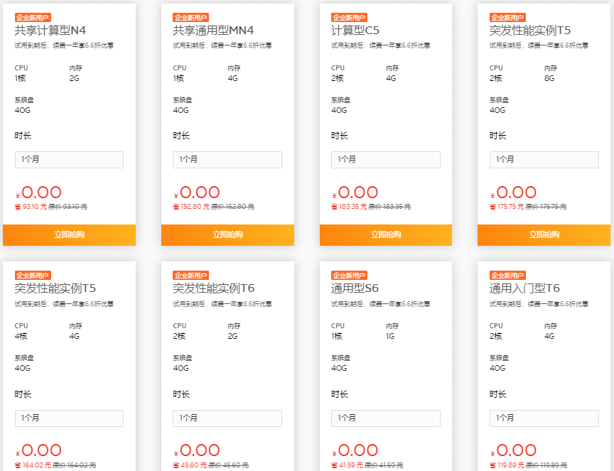 此次活动参与促销的机型配置包括:1核2G内存共享计算型N4、1核4G内存共享通用型MN4、2核4G内存计算型C5、2核8G内存突发性能实例T5、4核4G内存突发性能实例T5、2核2G内存突发性能实例T6、1核1G内存通用型S6和2核4G内存通用入门型T6,系统盘均为40G,详情见下图: