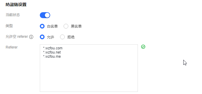 同时设置一下防盗链规则,允许列出的域名才能访问CDN的文件。
