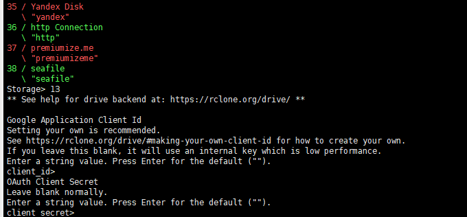 然后选择你要备份的网盘,这里以谷歌网盘为演示,id和Secret都不用填写,直接回车。